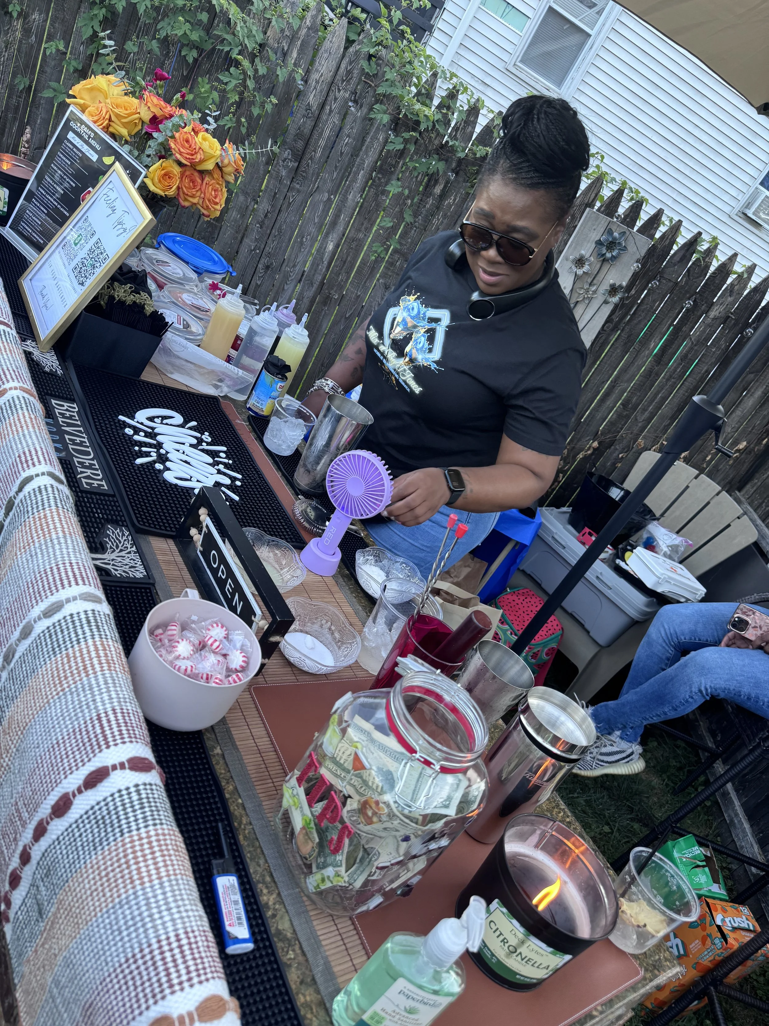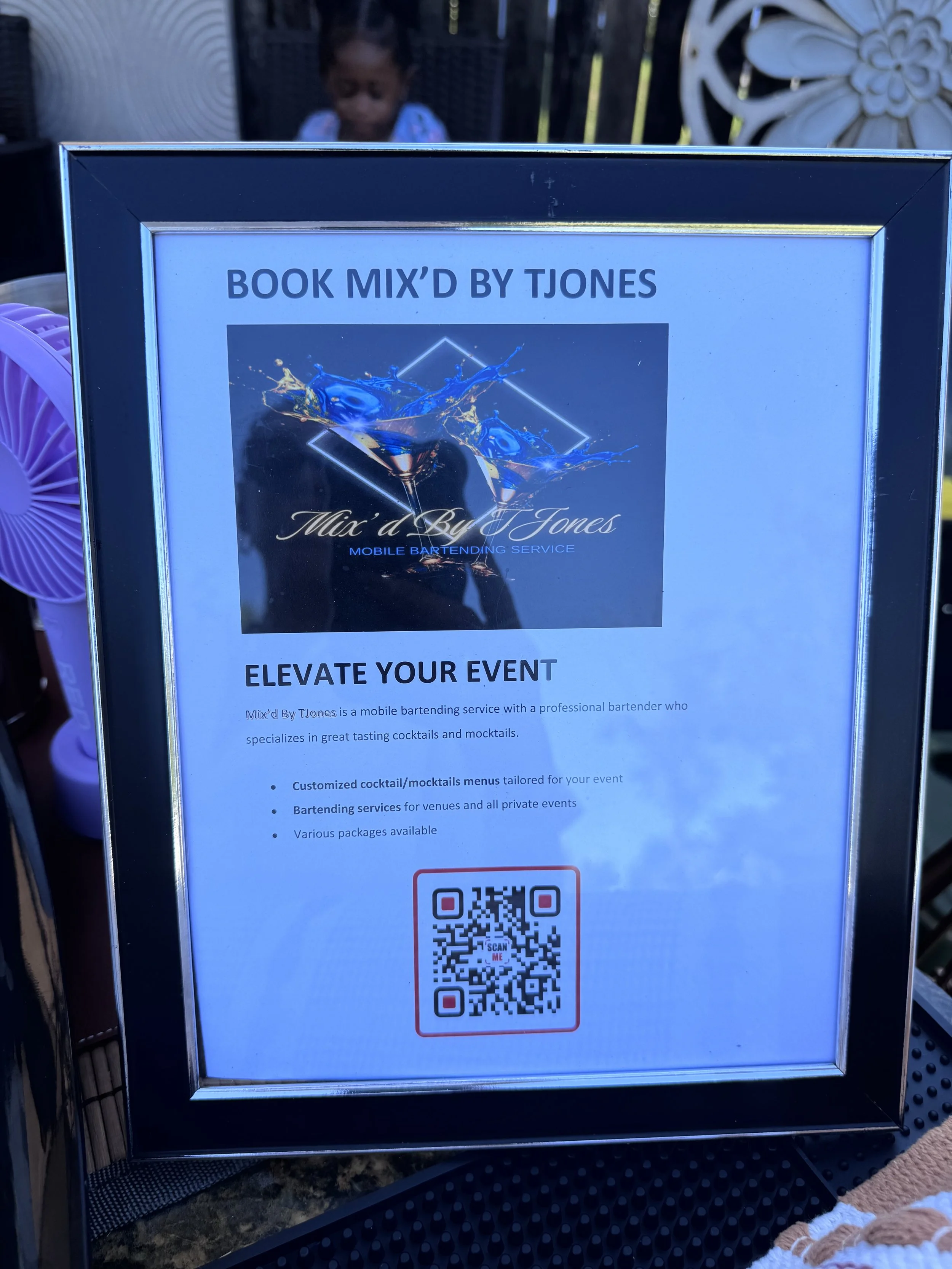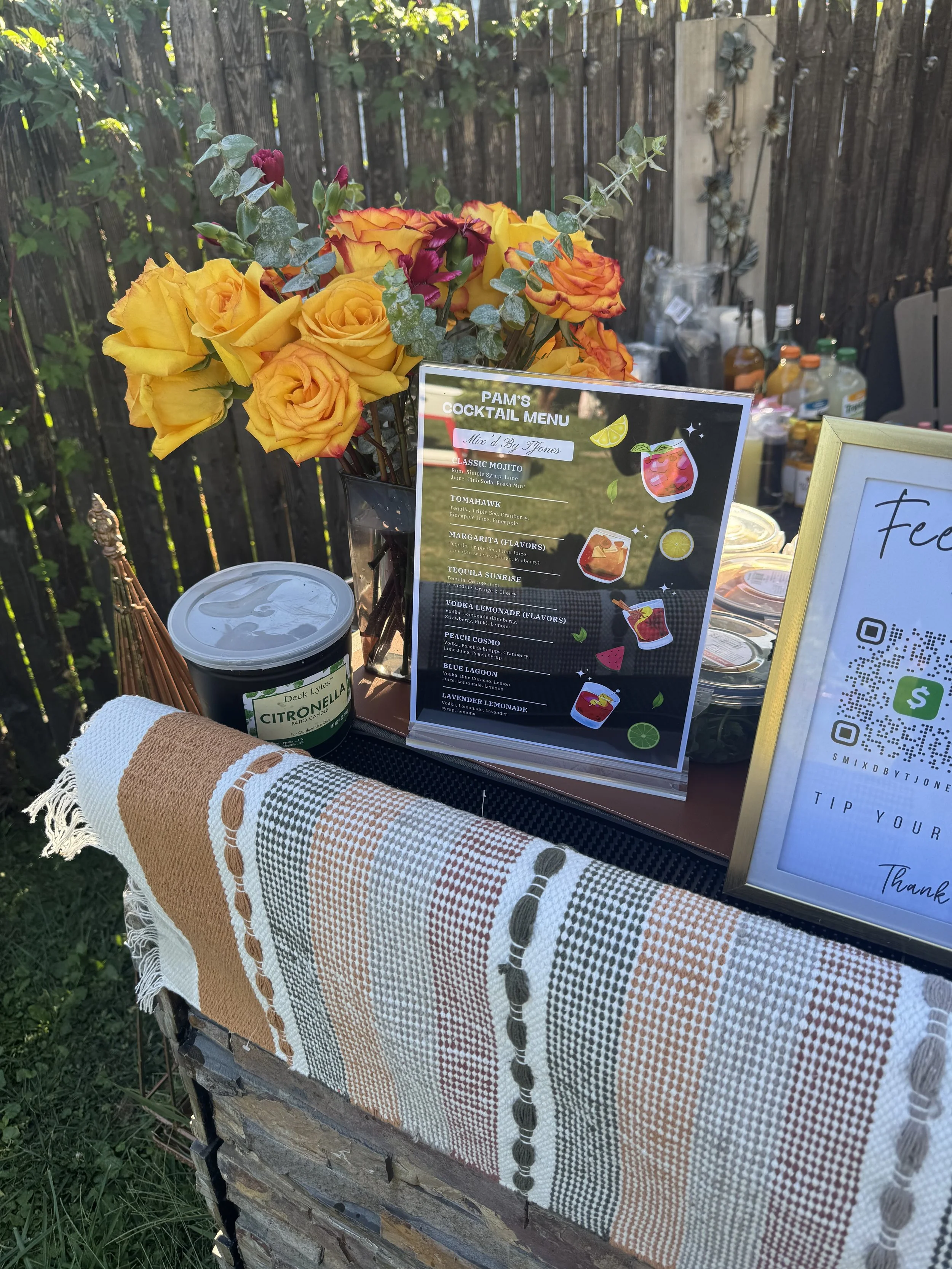 This package is $450 for up to 5 hours with a tip jar. If no tip jar the package is $600. Customized drink menu, garnishes, mixers, juices, bar tools, spill mats, cups, napkins and straws included. Also, includes the shopping of well brand liquor for the event.